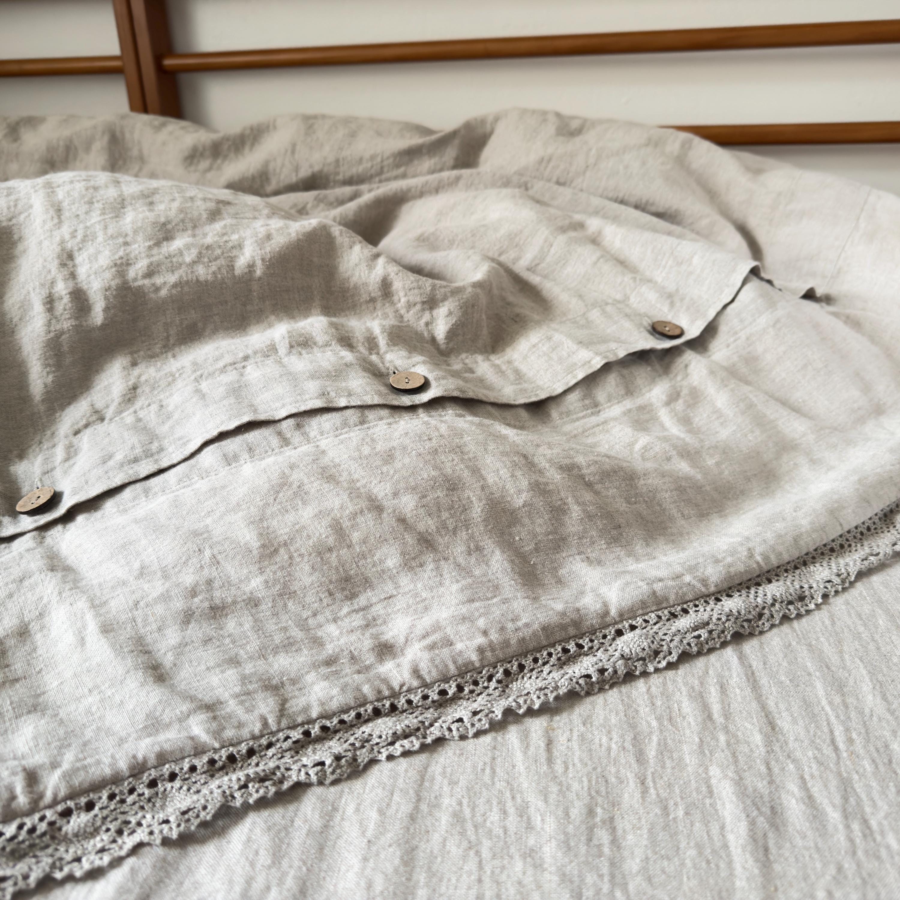 This luxurious linen duvet set in natural flax beige and off-white, finished with elegant linen lace trim is perfect for a romantic cottage or farmhouse-style bedroom.