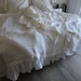 This duvet set includes a duvet cover with ruffles on 3 sides and 2 pillowcases whith ruffles on short side, available in Twin, Queen, King, custom sizes. Each piece is crafted from pre-softened, dye-free linen, known for its breathability, durability, and ability to keep you cool in the summer and warm in the winter.